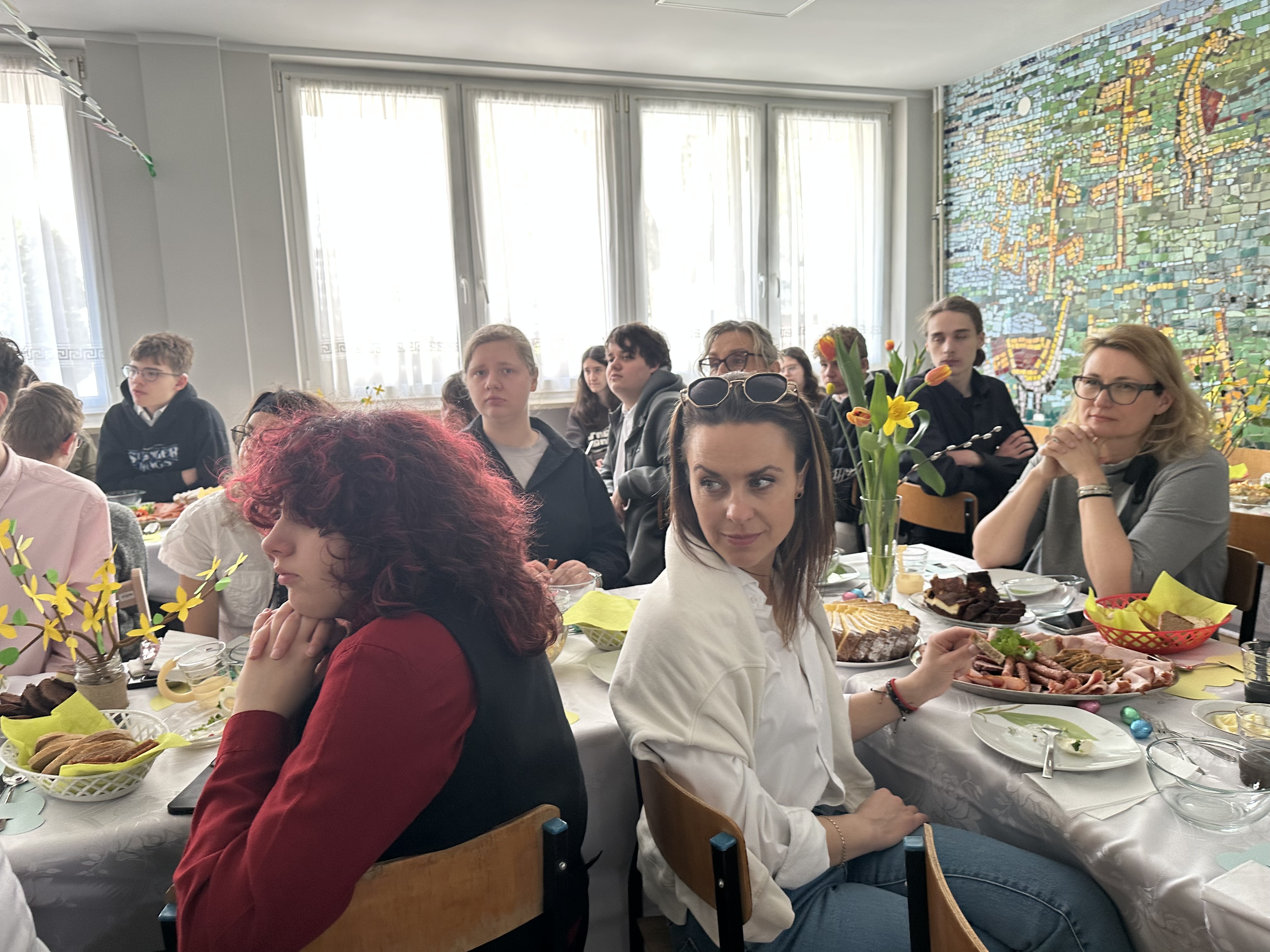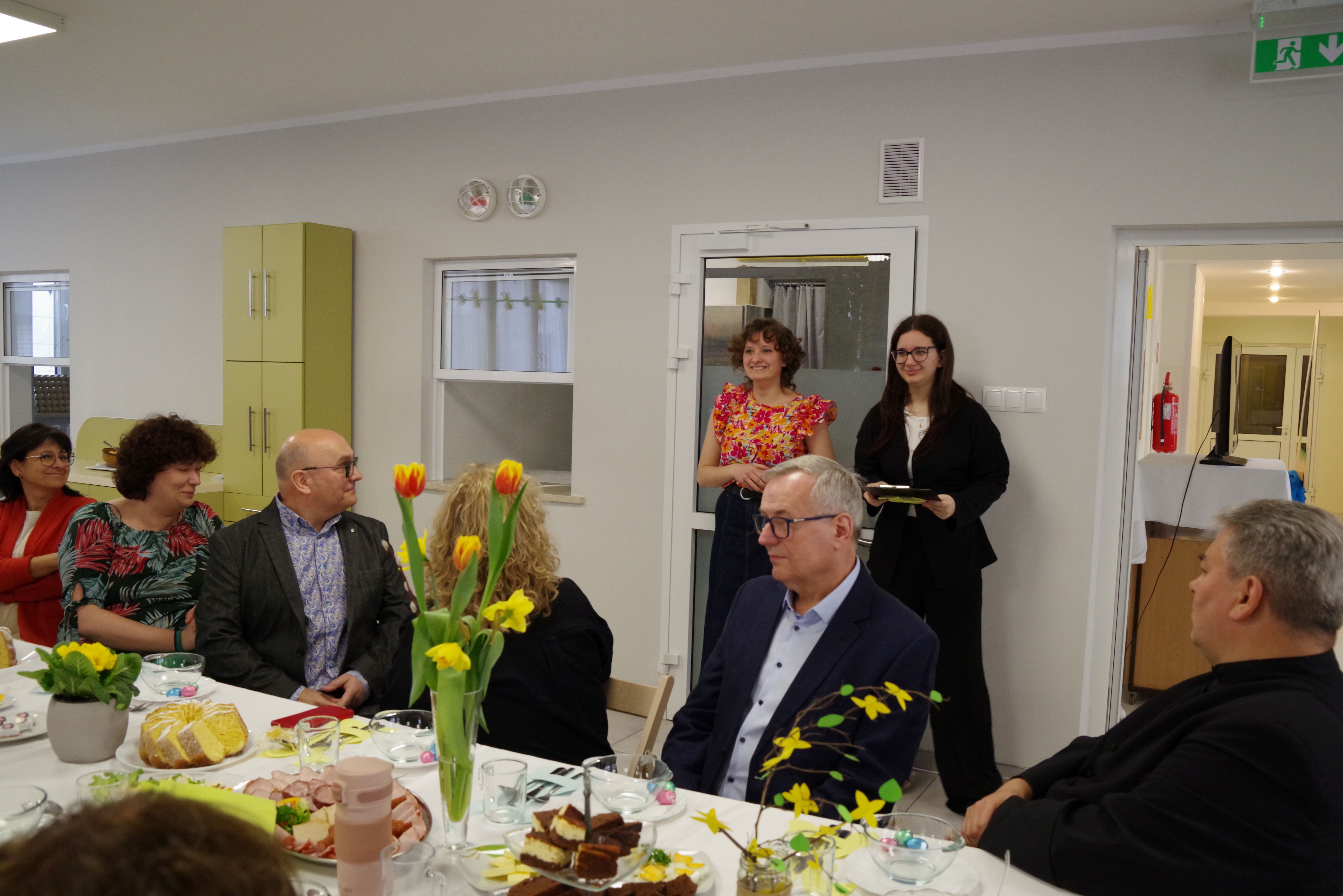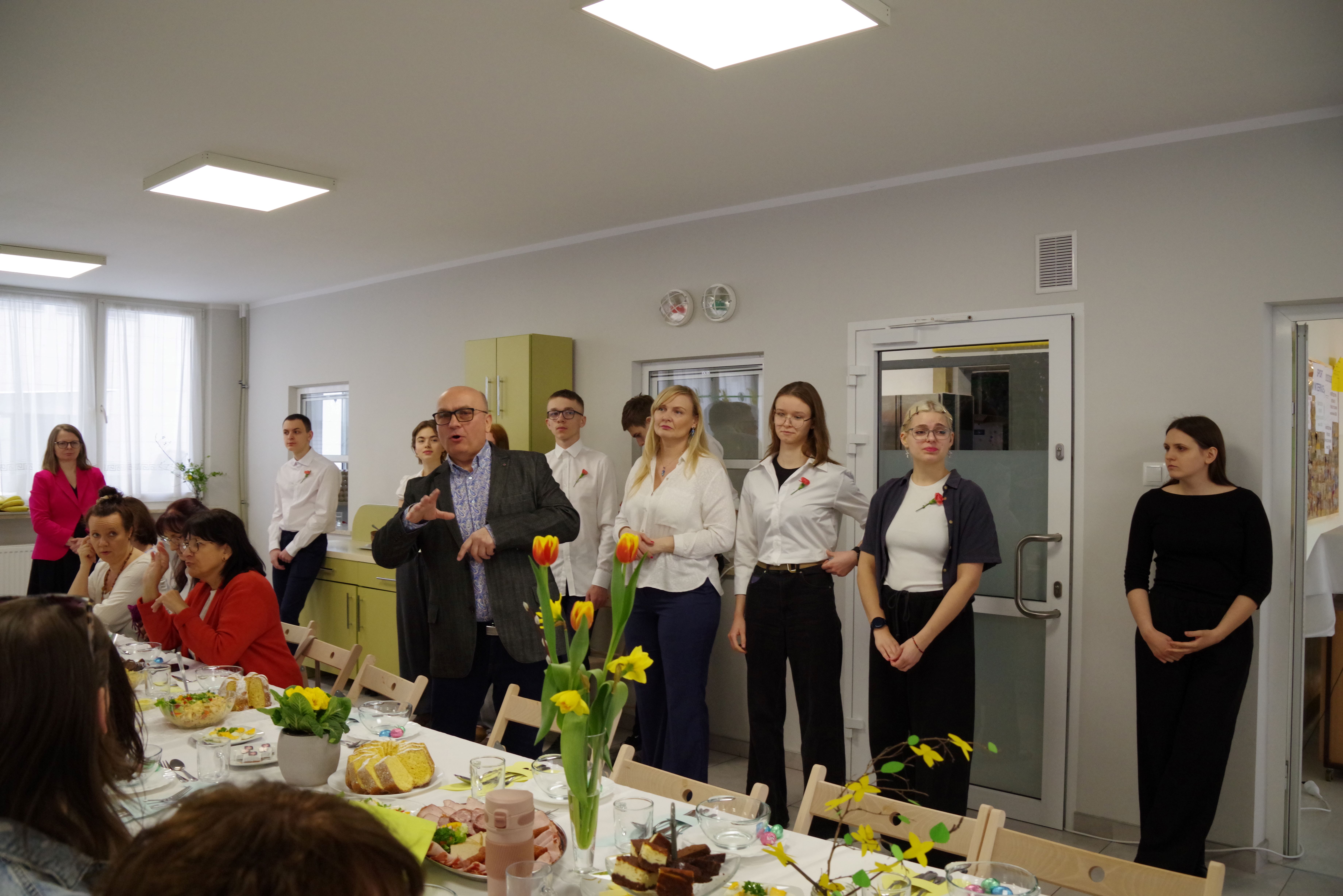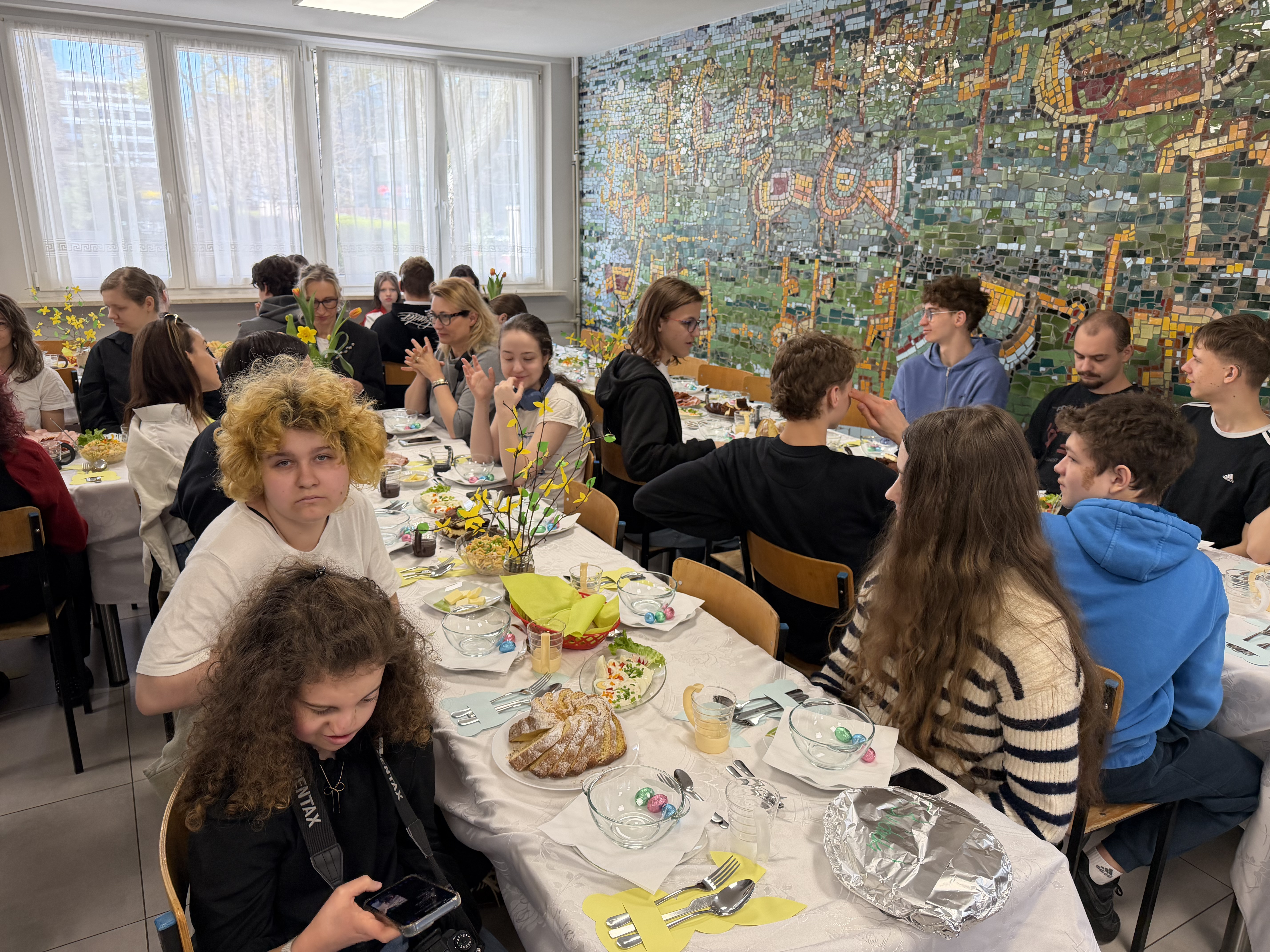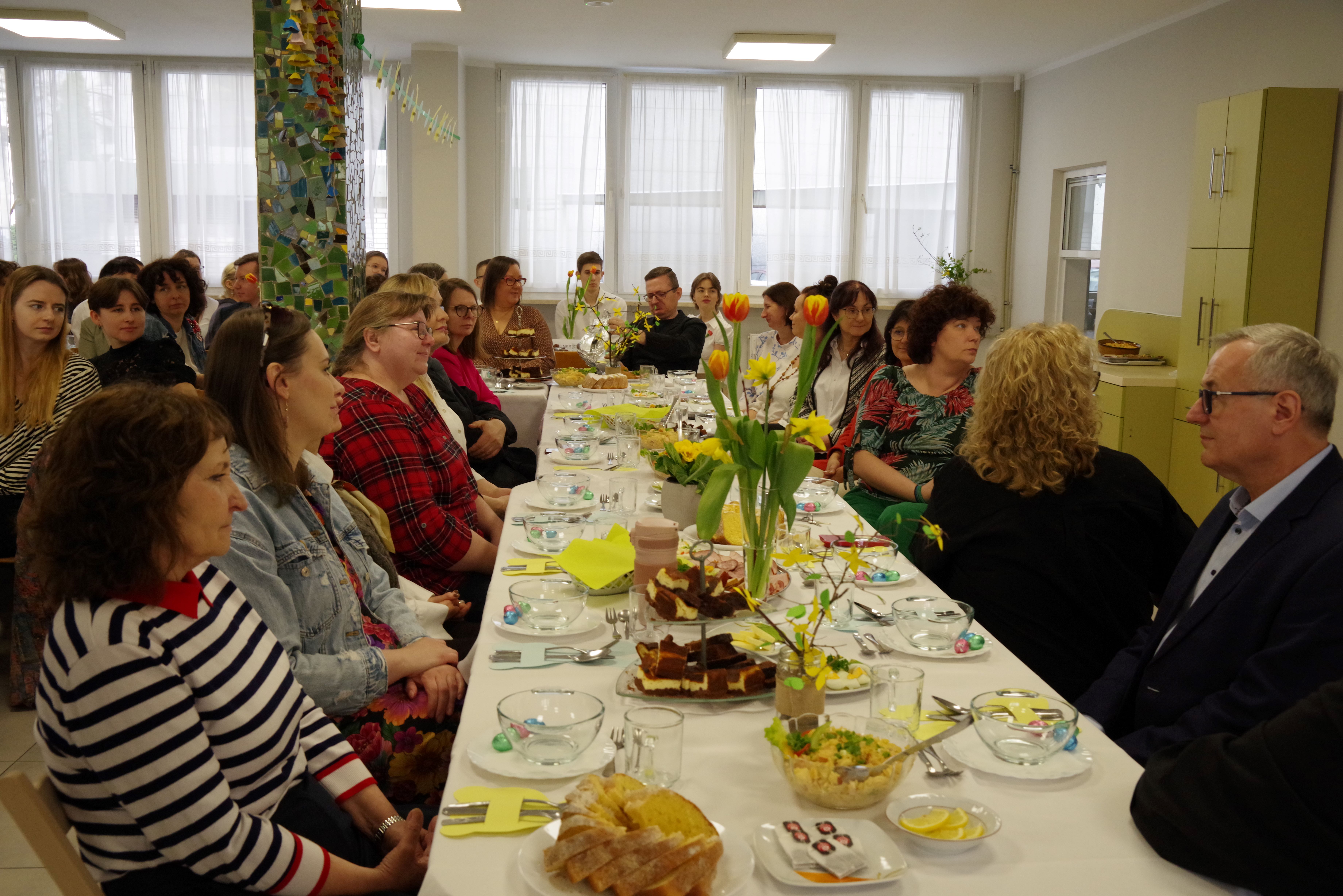 W środę przed Świętami Wielkanocnymi, jak co roku, społeczność Przystanku Łucka zebrała się na uroczystym Śniadaniu Wielkanocnym. Nasza stołówka, wysiłkiem wychowawców i młodzieży, jak zawsze była pięknie udekorowana. Zasiedliśmy przy suto zastawionych tradycyjnymi potrawami wielkanocnymi stołach, a na specjalnym miejscu stał ślicznie udekorowany koszyk wielkanocny przygotowany do poświęcenia pokarmów. Wysłuchaliśmy życzeń świątecznych Kierownika Internatu, Samorządu Uczniowskiego oraz ks. Konrada, który przypomniał o religijnym wymiarze Świąt Wielkiejnocy. Po wspólnej modlitwie poświęcone zostały nie tylko pokarmy w koszu ale także i my oraz nasze stoły. Dzieliliśmy się jak co roku jajkiem. Trzeba przyznać, że nasze panie przygotowujące potrawy sprawiły się wyśmienicie. Żurek i inne specjały wielkanocne smakowały wyśmienicie! Na koniec naszej uroczystości, grupa Bajkomigaczy zaprezentowała nam film specjalnie przygotowany na Wielkanoc. Radości i śmiechu było co niemiara!